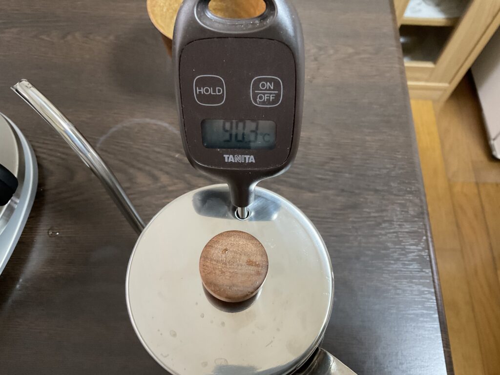 珈琲は温度が大切。熱湯を使えばいいわけではなく、92℃前後のお湯を使ったほうがよいのでなるべく温度は測りたいところですね。