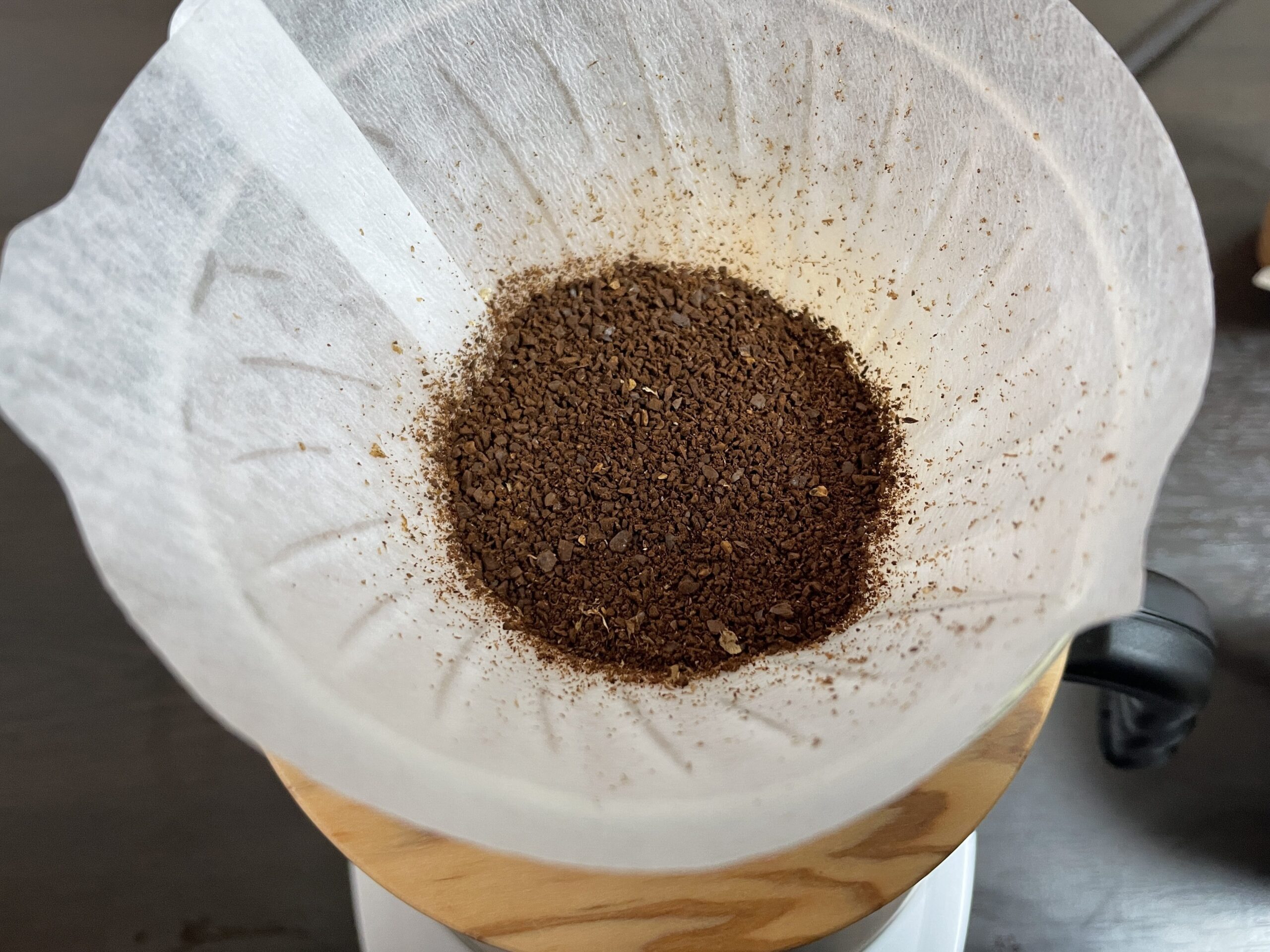 珈琲粉をペーパーフィルターに入れます。この時トントンと揺すり、平らに慣らしておくのがコツとなります。