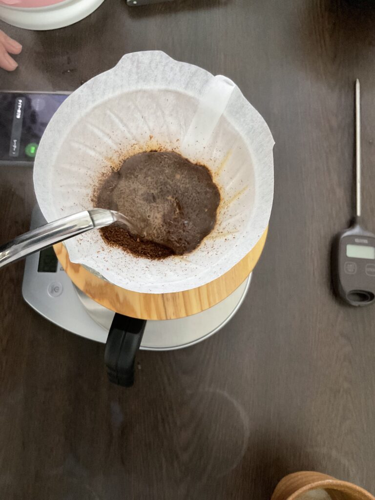 珈琲は蒸らし時間が大切。粉の中の空気やガスをここで排出させます。美味しい成分を引き出すためのお湯の通り道を作ることを目的としており、時間が長すぎれば雑味が出てしまうので40秒くらいまでにするのが吉です。