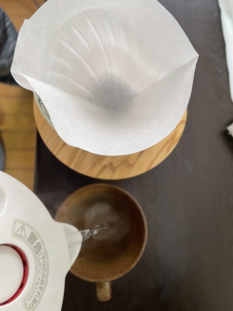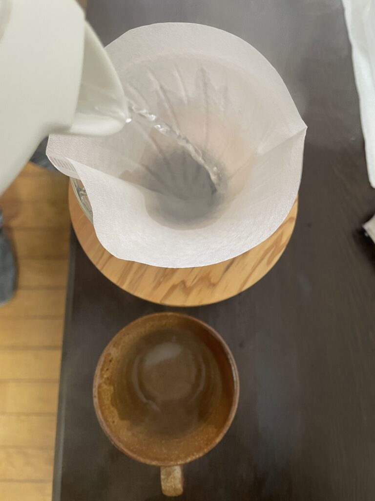 極端に温度が下がってしまわないように使う器具は温めておきましょう。セットしたフィルターの上からお湯を回し注ぎ温めます。