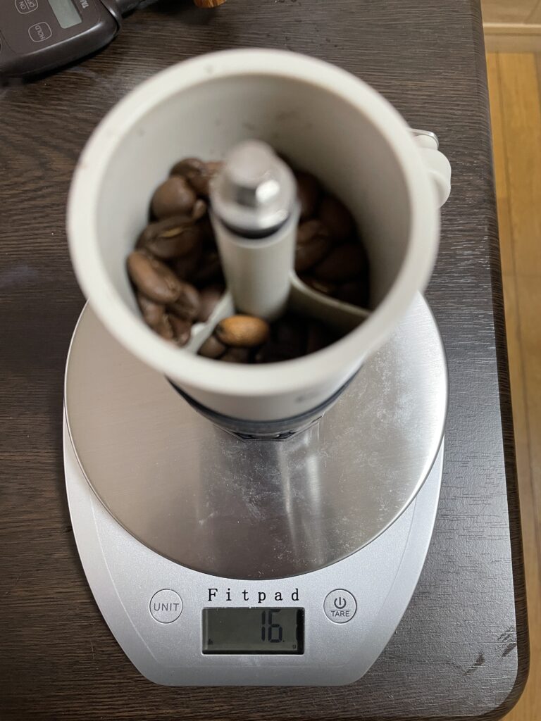 2杯用で16gの珈琲豆を使用します。キッチンスケールに乗せて豆の量を計りながら珈琲ミルに入れていきます。砕かれた珈琲の香りを愉しみましょう。