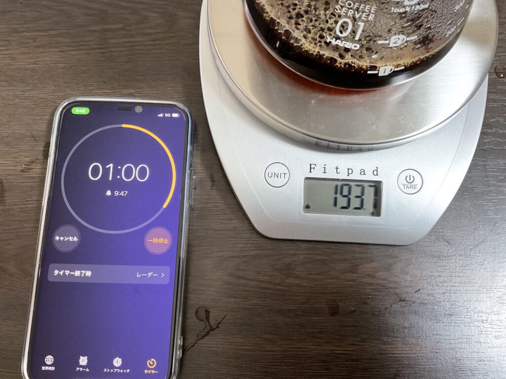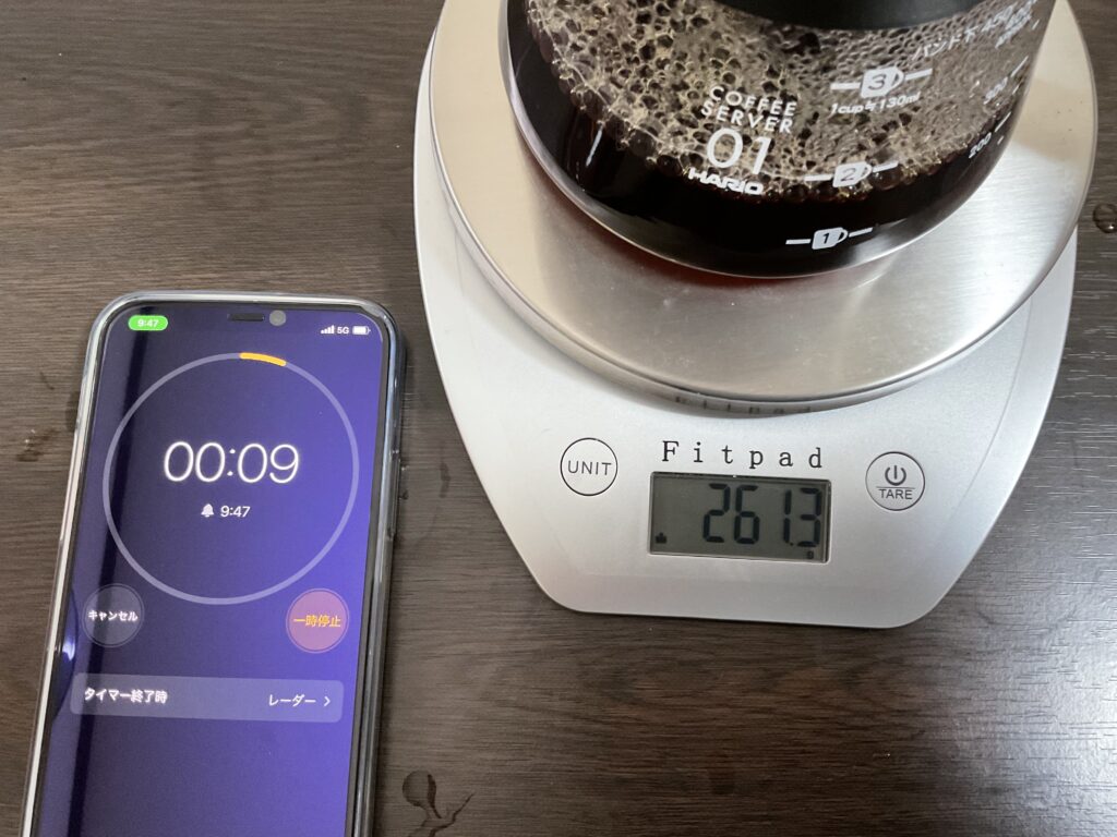トータル3分が経ったころ「260g」くらいである程度落ち切れば完成になります。あとはカップのお湯を捨て、珈琲を注ぎましょう!